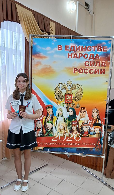 Главный документ вручили ученице 7а класса Диденко Марии. Мы гордимся её достижениями и уверены, что она достойно понесёт это звание гражданина России. Участники получили на память специальные обложки на паспорт с символикой Движения Первых, что явилось приятным и памятным дополнением к этому значимому событию.