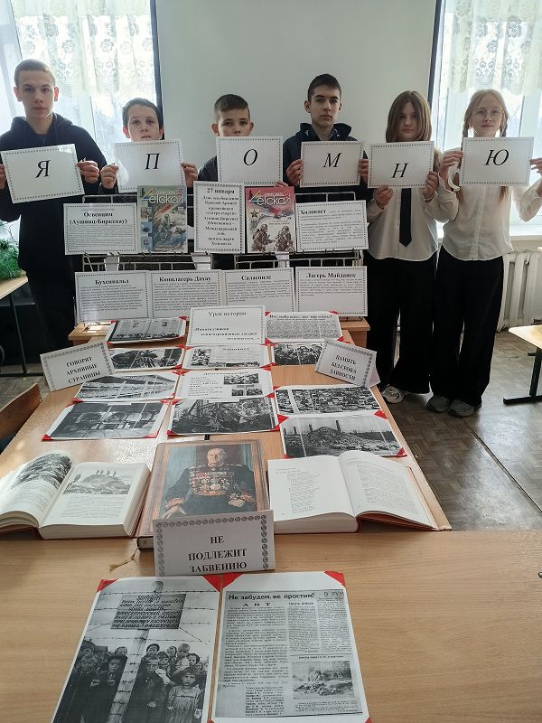 27 января 2026 года в рамках реализации плана мероприятий Месячника оборонно – массовой и военно – патриотической работы, в библиотеке школы была организована выставка «Памяти узников концентрационных лагерей посвящается…».